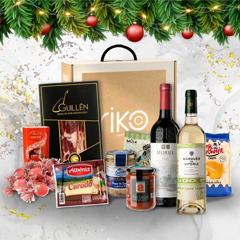Es una preparación más apañada, que incluye un montón de riquísimos productos metidos en una caja de cartón (de muy buena presencia y calidad. Por lo menos si lo compras en Riko Experiencias Gastronómicas).