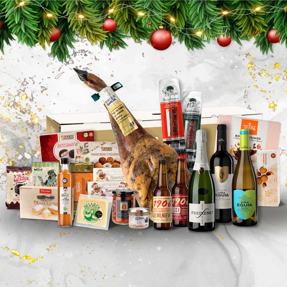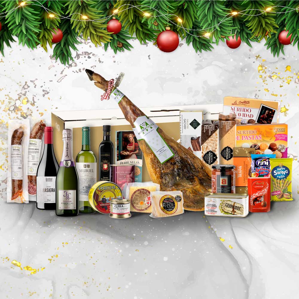 Tú decides si quieres en cesta, cajón de madera, baúl o en una elegante jamonera de cartón.