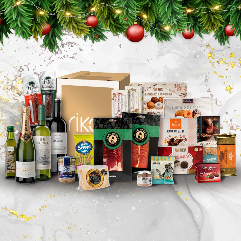 Imagina si caben ahí ricas viandas; jamón ibérico loncheado, chorizo de bellota o salchichón de bellota, lomo, queso, conservas turrón, polvorones, bombones…